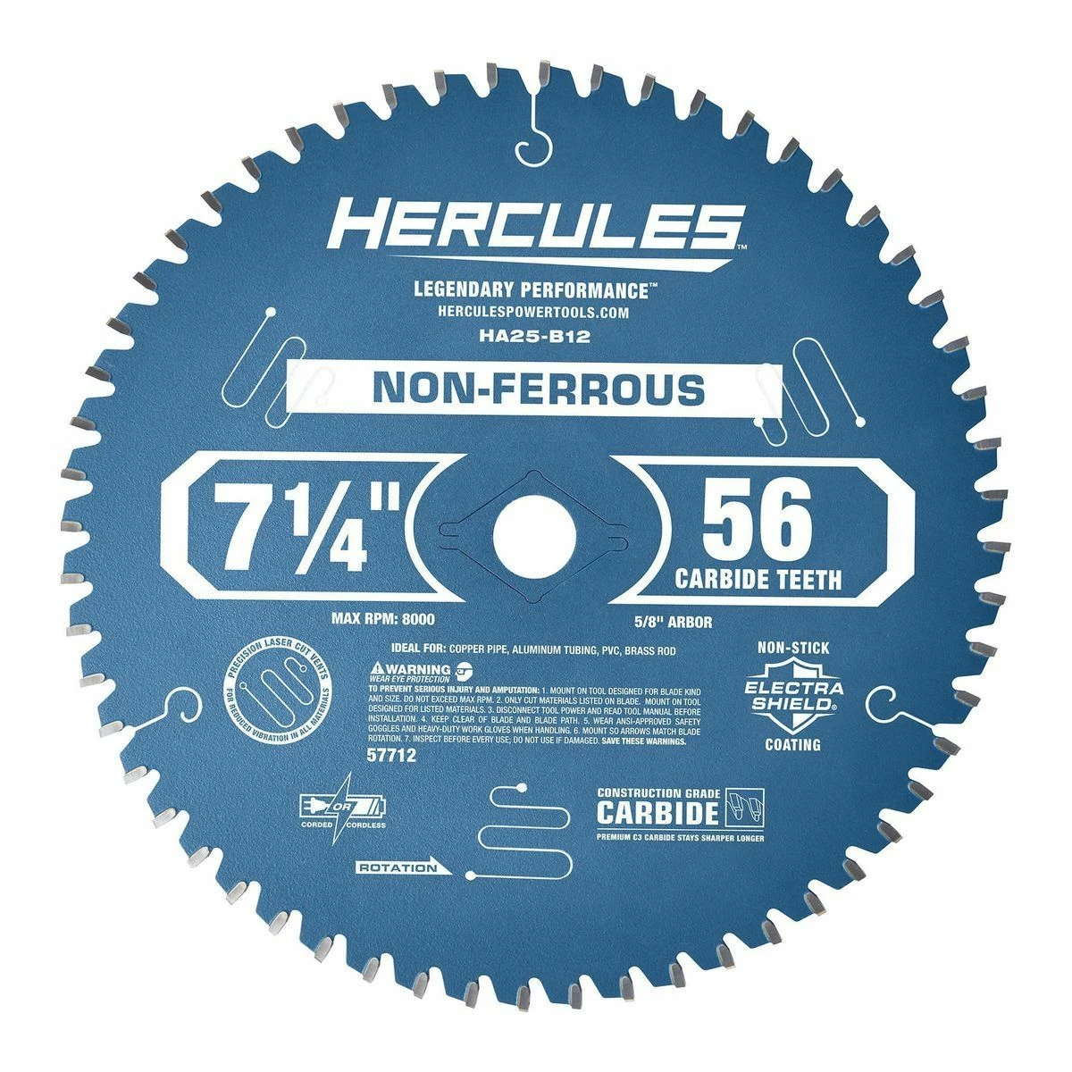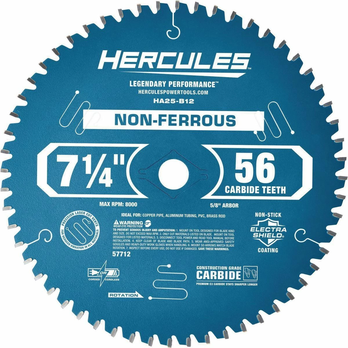 This HERCULESโข 7-1/4 in., 56T Non-Ferrous Circular Blade is specially engineered for cutting copper, aluminum, brass, fiberglass, PVC, and laminate. Precision laser-cut vents reduce vibration for smoother, more accurate cutting. The non-stick Electra-Shieldยฎ coating prevents sticking, gumming and burning.
