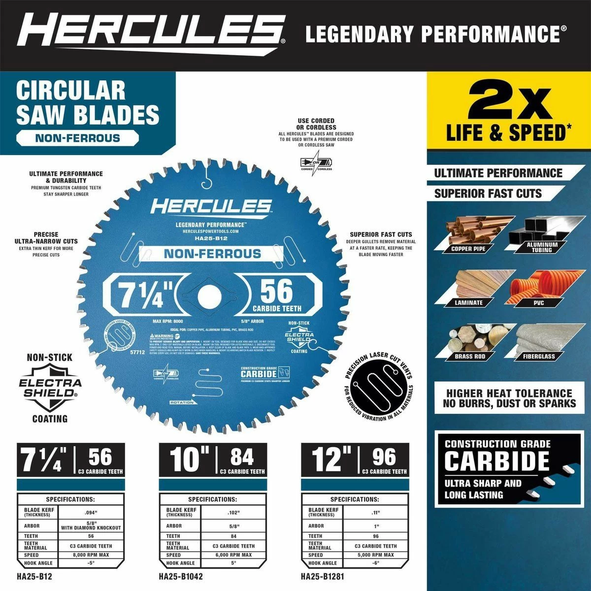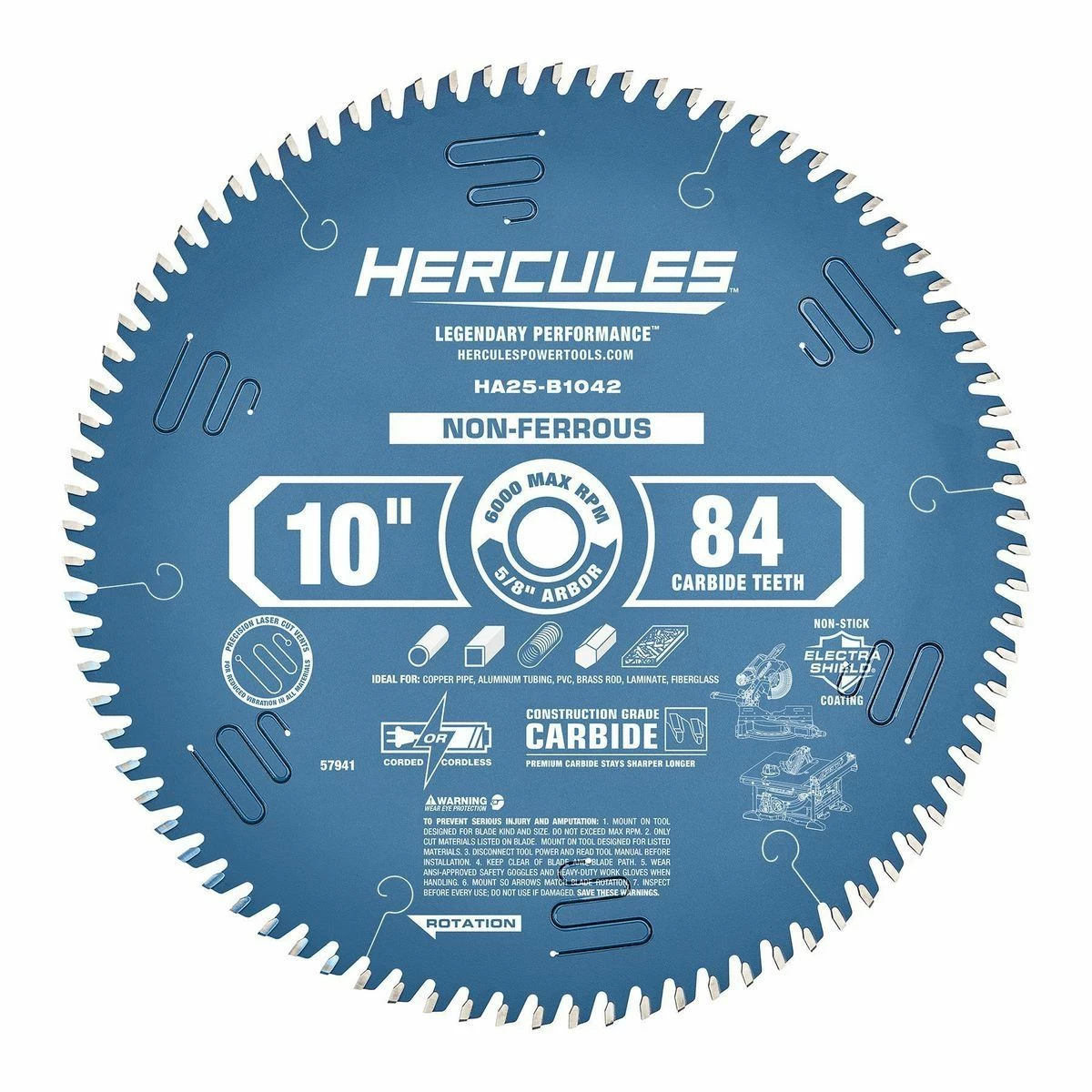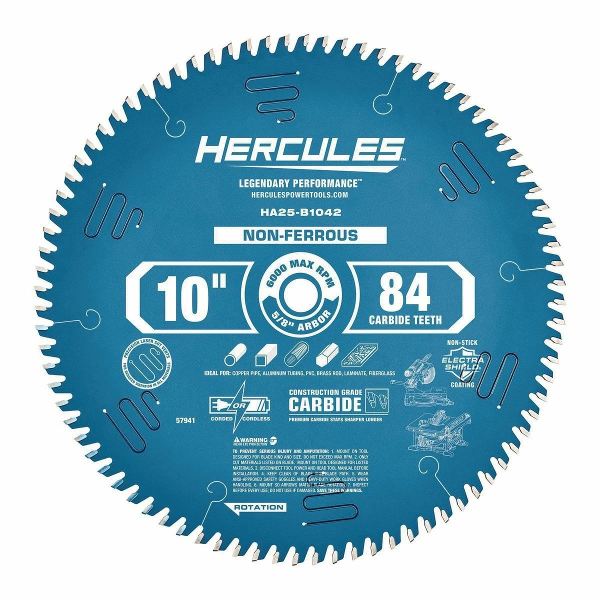 The HERCULES™ 10 in., 84T Laminate/Plastics/Non-Ferrous Metal Cutting Miter And Table Saw Blade combines premium carbide tips and maximum rigidity for superior blade life that runs truer longer. The beveled tooth design offers extreme durability in the hardest materials. Non-stick Electra-Shield® coating prevents sticking, gumming or burning. Ideal for copper pipe, aluminum tubing, PVC, brass rod, fiberglass, and laminate